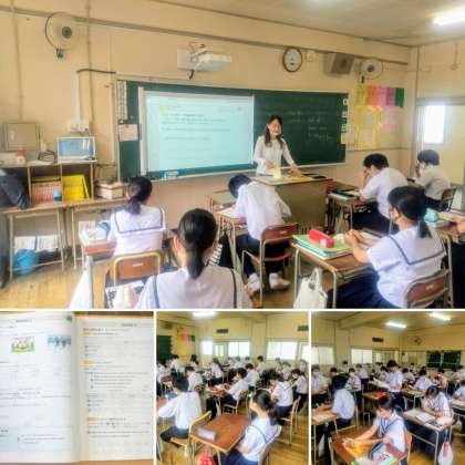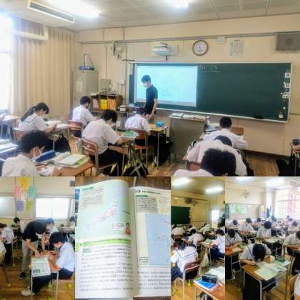 2年生の授業の様子です。1時間目は英語、社会、美術の授業が行われていました。英語では「インタビューの結果をまとめよう」という単元を行っていました。数名の生徒が指名され発表していました。社会では「日本の略地図の書き方」について勉強していました。工夫をして書けていました。美術では「文字のデザインを学ぼう」の単元でレタリングの練習をしていました。朝から集中して取り組めていました。