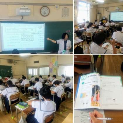2年生は数学と国語について学習していました。数学では連立方程式について学習していました。スクリーンに映し出された問題を考えながら学習していました。国語は詩について学習していました。ペアで学習し理解を深めていました。