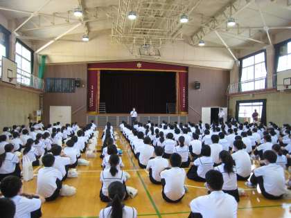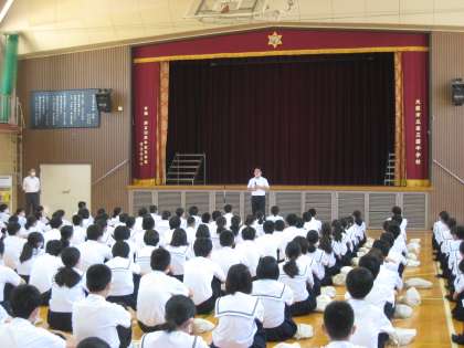今日(29日)、週の初め月曜日の全校集会を体育館で行いました。集合時は朝の時間帯ということもあり、汗をかくほどの暑さではありませんでしたが時間とともに今日は熱い一日になるようですので、こまめな水分補給を心がけるよう暑さ対策も万全にするようお願いしました。