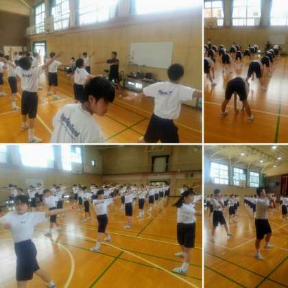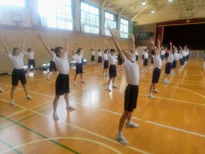 1年生の授業は体育館でラジオ体操が行われていました。先生の模範体操を見ながら音楽に合わせて体操が行われていました。手をしっかり伸ばそう、身体をもっと曲げようと言った先生のアドバイスできっちり体操が行われていました。
