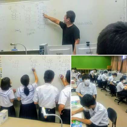 3年生技術の授業では始めの5分でタイピング練習を行います。少しずつブラインドタッチでキーボードを打つことができるようになってきましたね。授業では情報量の単位とコンピュータで扱われる2進数の計算について学習しました。よく頑張っていました。
