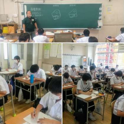 2年生の理科の授業では脊椎動物について学習していました。黒板に書かれた動物について「どちらが肉食動物でどちらが草食動物か」という先生の問いかけに生徒たちは興味をもって考えていました。