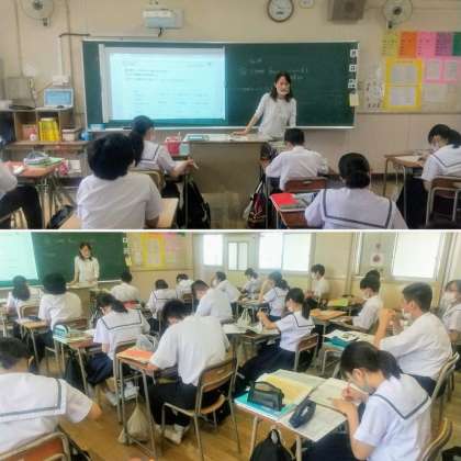 今日の2年生の英語の授業ではRead and Thinkについて学習していました。プリントで穴埋め問題を解いているところです。皆さん集中して取り組んでいました。大きい数の英語の読み方が詰まってしまう人がいるのでがんばって言えるように練習してください。