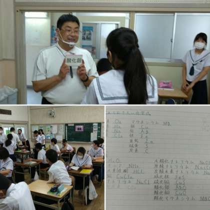 3年生の理科の授業では元素記号のテストが行われていました。教科書やノートを見て元素記号を復習していました。先生が一人ずつカードを見せて該当する元素記号を答えていました。