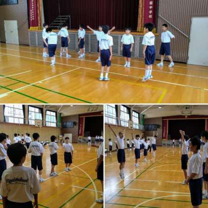 1年生の男子体育の授業ではグループでラジオ体操の練習が行われていました。先週は一つ一つの体操の動作についてアドバイスがありましたが今週はグループで考えながら上手に体操を行っていました。
