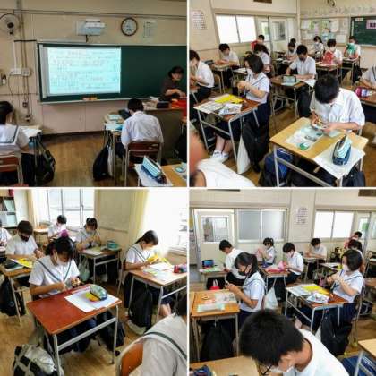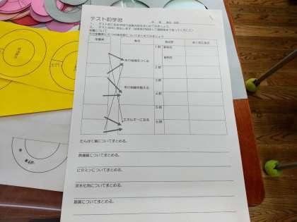 3年生の家庭科の授業では保育の単元で「幼児のおもちゃ作り」の実習が行われていました。同時に2週間後に行われる1学期期末テストのまとめプリントも配布がありました。2週間に一度の授業です。必ず復習を行いましょう。