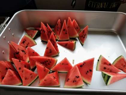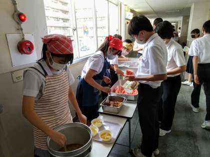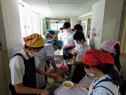 午前の授業を終えて給食の時間です。今日の献立は大人気のスイカ!午後からの部活動編成も頑張れますね。