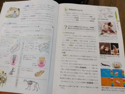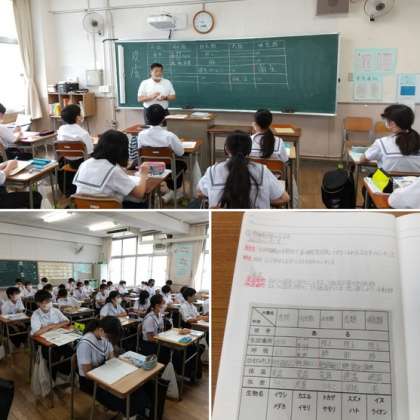 今日も学校生活はスタート!あいにくの天気ですが元気な様子で登校する生徒が多く今日も朝学活で元気な挨拶をする姿が見られました。さて、1年生の理科の授業の様子です。前回の授業に引き続き、生物の分類の説明がありました。生徒たちはプリントに魚類、両生類、は虫類、鳥類、ほ乳類に分けて特徴をまとめていました。