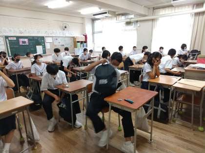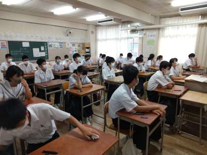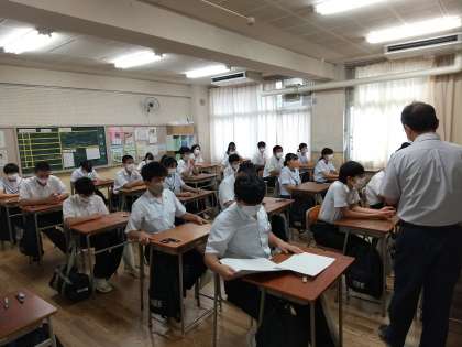 今日はこれから3年生の実力テストがあります。朝学活後どのクラスの生徒たちも最後まで問題集やノートをチェックし配る寸前まで学習していました。今までの学習の成果を出し切って頑張ってください。