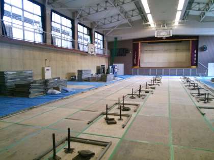 体育館内も吊り天井の工事のための足場が組まれるよう準備されてい