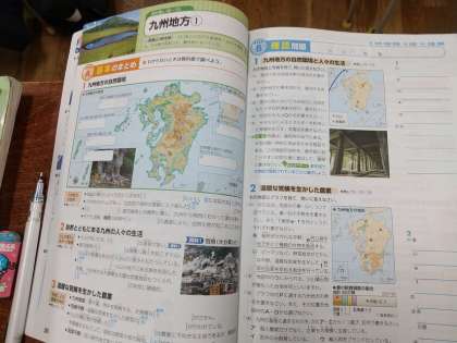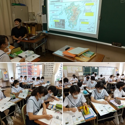 2年生社会の授業では九州地方の自然環境について学習しています。自然と共にある九州の人々の生活や温暖な気候を生かした農業などを学習しました。大きな地図が教室に貼っていて生徒たちは想像しやすい状況で授業を受けています。