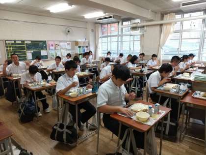 今日の給食中の写真です。給食が始まるまでの少しの間には友達同士のコミュニケーション、先生と生徒とのコミュニケーションの中で笑顔がたくさんありました。3年生の給食の雰囲気です。