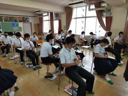 給食が終わり少し眠たくなる時間になりましたが生徒たちは午後の授業に臨んでいます。3年生は音楽の授業です。リコーダーの練習をしています。丁寧な音色のリコーダーが部屋を包んでいました。
