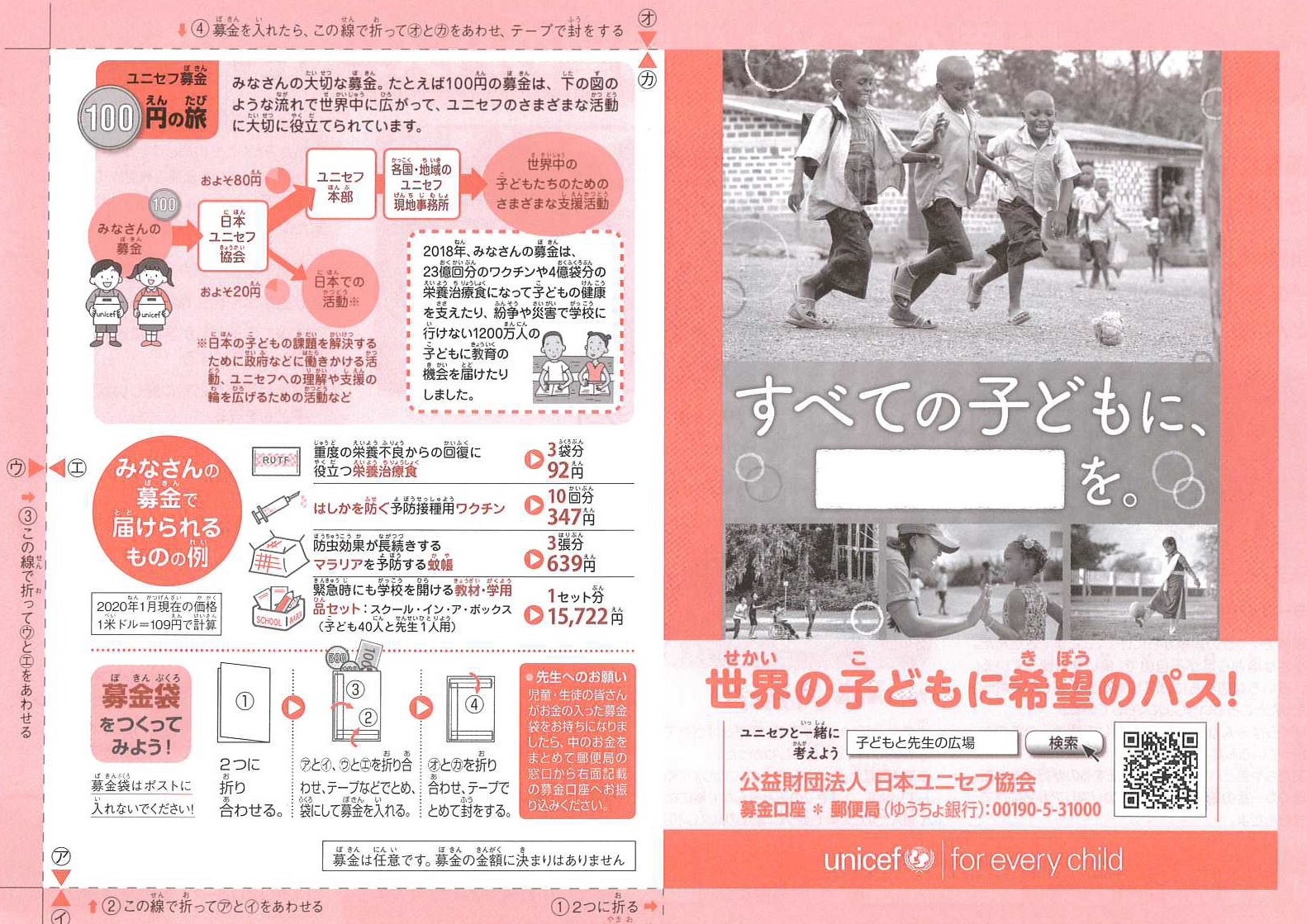 皆さんは「ユニセフ」を知っていますか。「ユニセフ」は「国際連合児童基金」といって、世界の子どもたちの命と健やかな成長を守るために活動している国連の機関です。皆さんから寄せられる募金に支えられ、様々な活動をしています。コロナや自然災害で大変な時ではありますが、配布されるチラシをご覧いただければ幸いです
