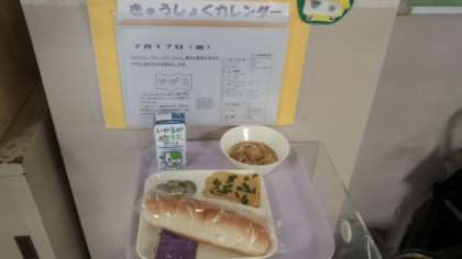 豚肉と野菜の煮もの チヂミ きゅうりの甘酢あえ 大型コッペパン ブルーベリージャム 牛乳