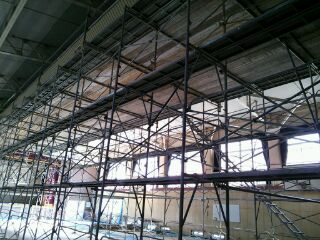 高く天井まで届く足場が出来上がり、電気関係の業者も参加して