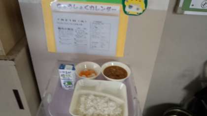 チキンカレーライス⇒食材に金時豆使用 フルーツ白玉 牛乳