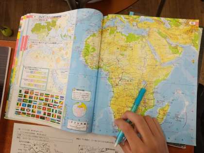 1年生の社会の授業ではアフリカ州の自然環境について学習しています。世界で一番大きいサハラ砂漠について先生から説明がありました。