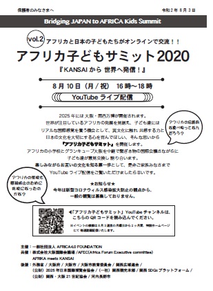昨日(5日)、大阪市教育委員会より「アフリカ子どもサミット 2020 『KANSAI から世界へ発信!』」 の周知 について依頼がありました。プリントは本日配布させていただきます。ご一読いただければ幸いです。