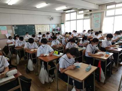 1年生の朝読書の様子です。書いてあることの面白さを知ることはもちろんですが文字になれる。文章を理解するうえで大切ですね。
