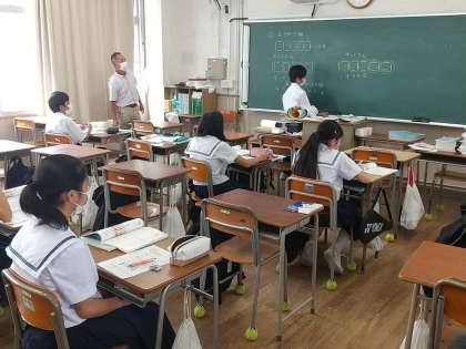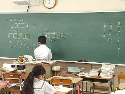 2時間目の1年生の授業は数学の授業が行われていました。文字と式の単元を学習しています。授業で分からなかったら先生に質問ができる人数で授業が行われています。授業では指名された生徒が黒板に向かってみんなに説明をしている様子です。