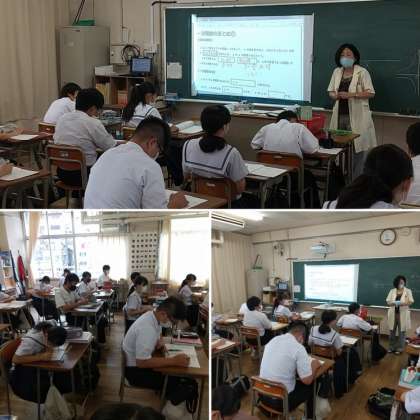 2年生の数学の授業の様子です。一次関数のまとめを行っています。黒板のスクリーンに映し出された問題を先生が解説されています。単元の内容はしっかり理解できましたか。