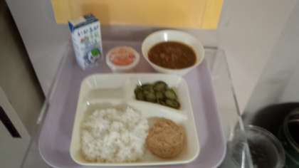 牛肉と大豆のカレーライス 米粉とうふハンバーグ きゅうりのピクルス りんごゼリー 牛乳