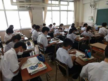 1年生の国語の授業では前回の課題の返却が行われました。Aがつけられている生徒がいて「良かった」といった表情の生徒の姿が数名見られました。文章を書く基本をしっかり覚えましょう。