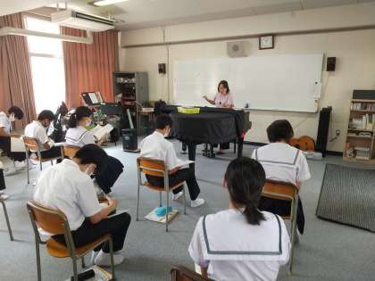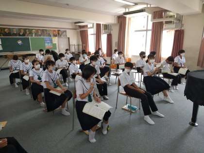 2年英の音楽の授業は「ラバーズコンチェルト」について学習しています。音符の確認などが行われていました。もう皆さん楽譜は読むことができますか。