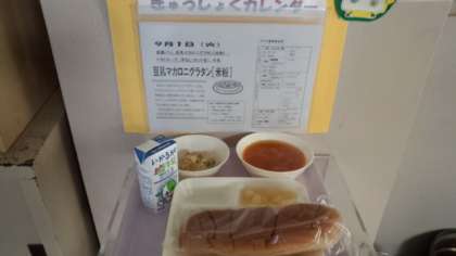 豆乳マカロニグラタン トマトスープ 洋なし(カット缶) 黒糖パン 牛乳