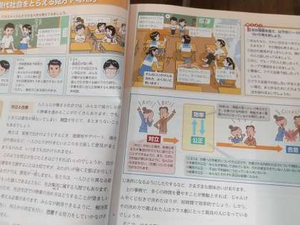 3年生は現代社会について学習しています。授業の中でビデオ視聴を通して担当教員が今日の要点について説明しています。教科書には「対立」「公正」「効率」についてでてきています。