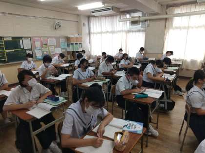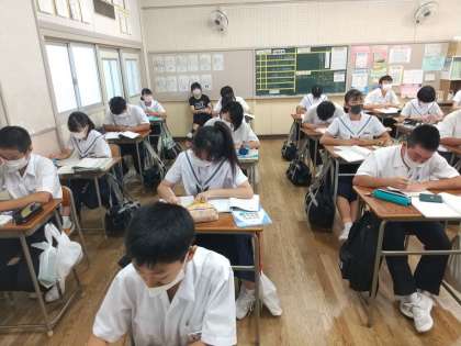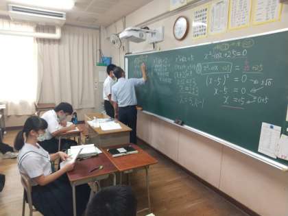 3年生の授業では二次方程式について学習しています。黒板に書かれた問題を生徒が取り組んでいます。担当の先生のアドバイスを受けながらあてられた生徒が解きに来ています。実力テストの結果はどうでしたか。まずは間違って理解してしまったところの復習から頑張りましょう。
