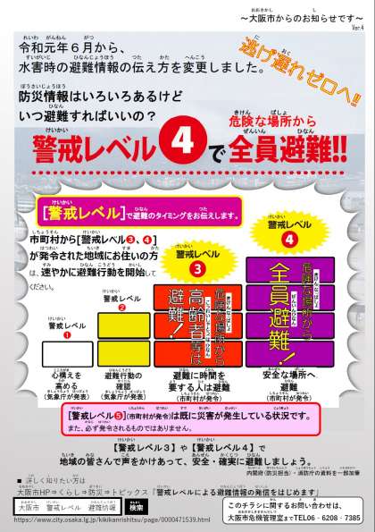 水害時の避難情報の伝え方が「避難準備・高齢者等避難開始」等から「警戒レベル3」等に変更となっています。一方、気象庁等から出される防災気象情報にも「警戒レベル3相当情報」等があり、大変分かりにくい状態となっていますので注意が必要です。なお、学校における臨時休業措置の措置基準は 、大阪市(危機管理室)が発令する河川氾濫で、所在する区の淀川、神崎川、高川、天竺川で「警戒レベル3」「警戒レベル4」の場合となります。