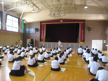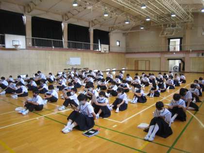 今日(4日)、5・6時限目に体育館で1年生の校外学習についての説明がありました。本来なら1学期に実施している一泊移住ですが、コロナ禍で2学期での実施となっていました。しかしながら、感染症の収束が見込めないこともあり日帰りの活動に変更をいたしました。