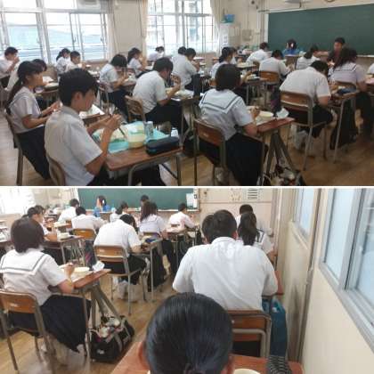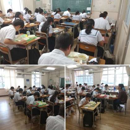 今日の給食は3年生にお邪魔しました。あるクラスでは担任の先生、副担任の先生と生徒たちの会話が弾んでいて楽しそうでした。今日の給食は鮭がでてきました。おいしいですね。