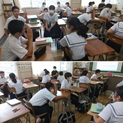 2年生の英語の授業では2人1組で会話の練習が行われています。ペアになった2人が恥ずかしがらずに英語で話をしています。「私は〜しなければならない。」についてしっかり会話ができていました。