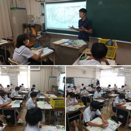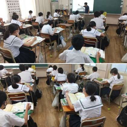 2年生の社会の授業は中部地方の産業について勉強しています。担当者が車の製造とそれに関わる下請などの話がありました。車一台を作るためには相当な部品が必要になりそのためには色々な業者も必要になってくるのですね。生徒たちは担当の先生が尋ねる質問に興味をもって答えていました。