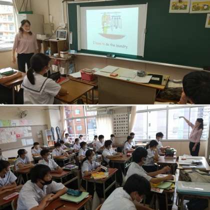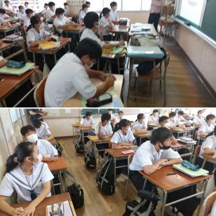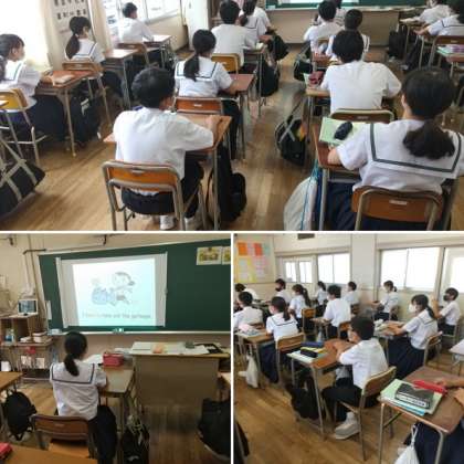 2年生の英語の授業は「have to〜」について学習しています。スクリーンに映し出された英文に関して手を挙げて答えていました。英語の授業では英語で聞かれたことに対して自然に英語でかえすことができるようになってきましたね。「I have to study.」に関しては手が少し上がらなかったですね"(-""-)"勉強は頑張ってください!