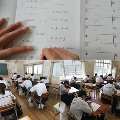 3年生の数学の授業ではまとめの計算問題に臨んでいます。今まで学習したことはしっかり理解できているかを練習問題を通してはかっています。全てが理解できていることがベストですが日々の学習では完璧はなく少しずつ抜け落ちるものです。まずは理解できていなかった箇所の把握を!