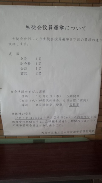 昨日(14日)、放課後に選挙管理委員会が生徒会後期役員選公示の準備をしていました。その公示が今日(15日)ありました。