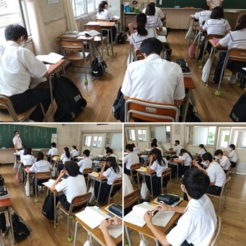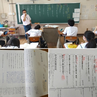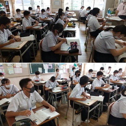 3年生の国語の授業では「奥のほそみち」について学習しています。出てくる文章の表現で難しい部分を担当の先生が説明されています。生徒たちはノートに文章をぎっしりと書いていました。頑張って新たな表現については覚えられるようにしてください。