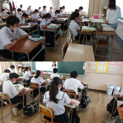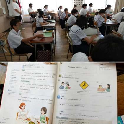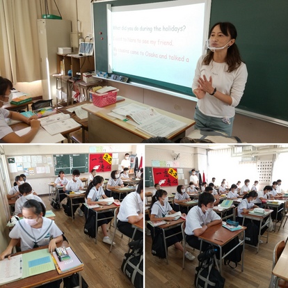 2年生の英語の授業では授業の最初のウォーミングアップで英語で挨拶や会話のやり取りが行われていました。じゃんけんを行い勝った人が負けた生徒に英語で尋ね、それを答えるアクティビティが行われていました。
