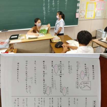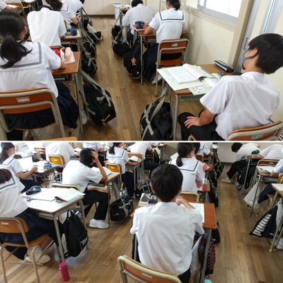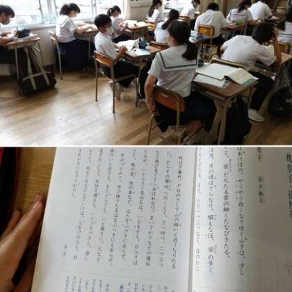 2年生の国語の授業は徒然草の暗唱テストが行われていました。順番を待っている生徒たちは暗唱内容を思い出しながら復習していました。