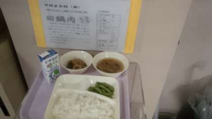 ホイコウロー 中華スープ えだまめ ごはん 牛乳