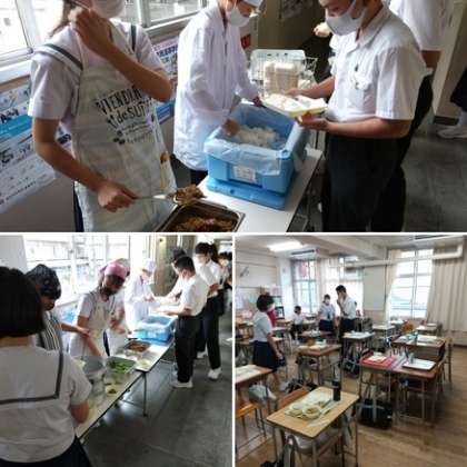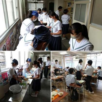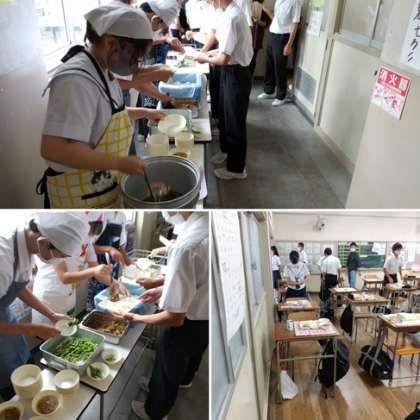 2年生と同じく3年生も給食の配膳を行っています。今日のメニューもおいしそう!3年生は6時間目の総合で体育大会の練習が行われます。たくさん食べて元気に昼からの2つの授業に臨めるようにしてください。
