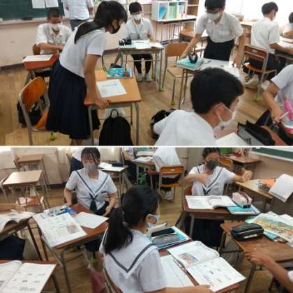 3年生の英語の授業はC−NETの先生による英語の授業が行われていました。教室内で先生が英語で指示をされている事を聞き行動をしていました。授業でしっかり英語が聞き取れるようになったことはとても素晴らしいことです。さすが3年生!