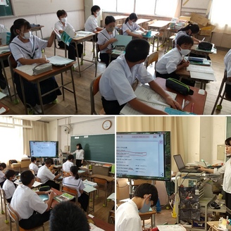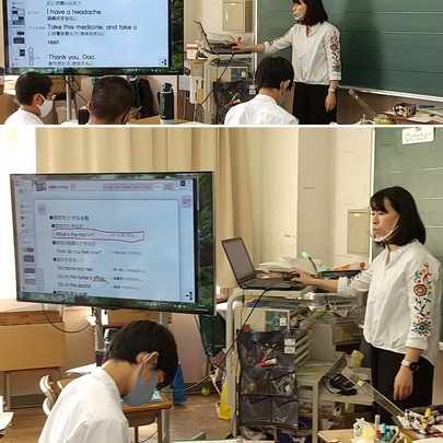 1年生英語の授業では少人数で行われています。今日の単元は「体調の悪い人に対して尋ねる英文」を学習していました。大型テレビに映し出された英文がとても見やすいですね。