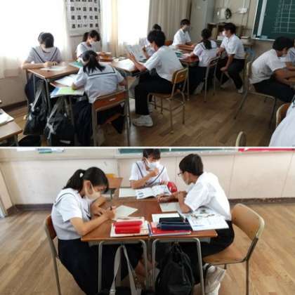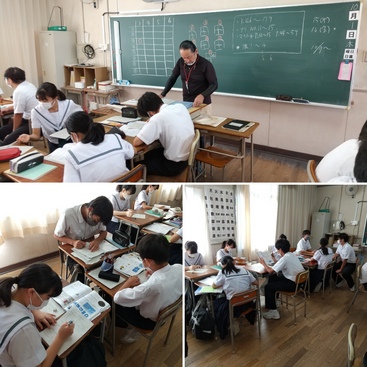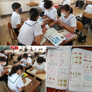 2年生の理科の授業では教科書の途中にある学習のまとめについてグループで学習しています。友達同士理解を深めています。物質の成り立ちや物質を表す記号、様々な化学変化についてが教科書に記載されていました。