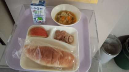 鶏肉のガーリック焼き 豚肉と野菜のスープ煮 りんご おさつパン