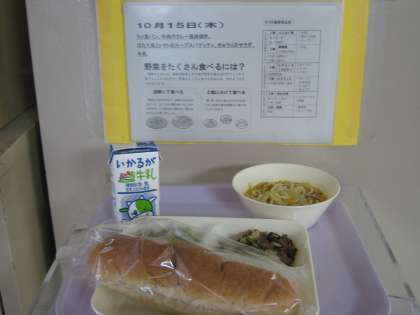 牛肉のカレー風味焼き、ほたて貝とトマトのスープスパゲッティ、きゅうりのサラダ、ライ麦パン、牛乳